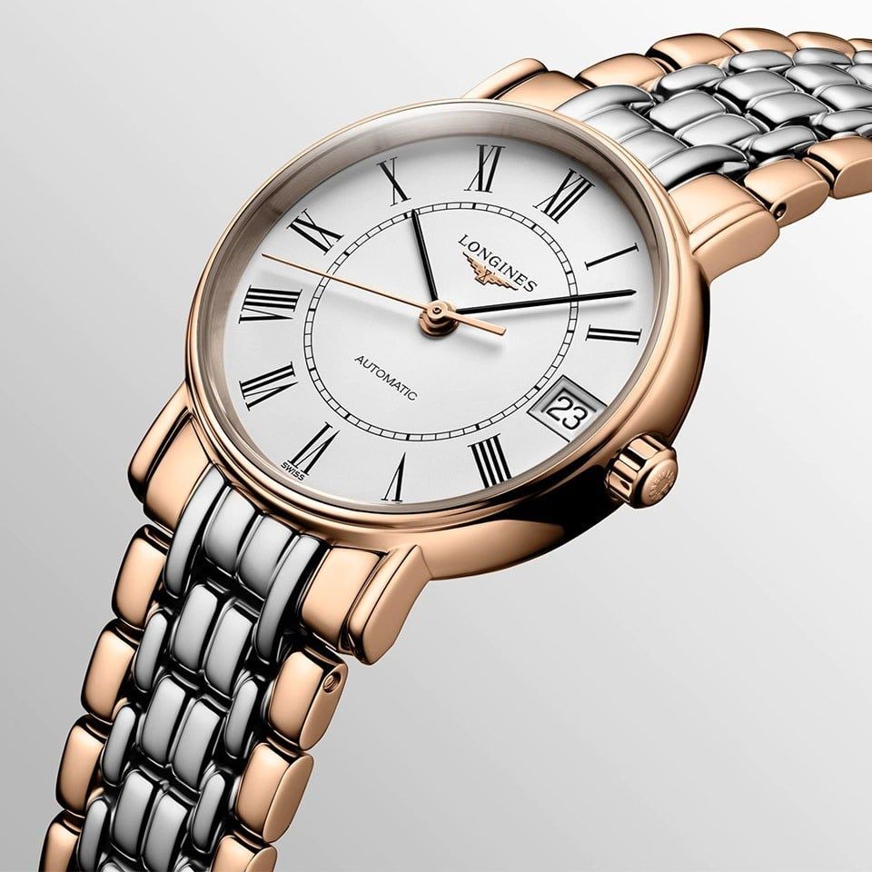 Mẫu đồng hồ Longines này kết hợp tinh tế giữa thép không gỉ và mạ vàng hồng PVD cao cấp, tạo nên vẻ ngoài thanh lịch và sang trọng vượt thời gian. Mặt số trắng trang nhã với cọc số La Mã cổ điển, cùng cửa sổ lịch ngày ở vị trí 3 giờ, mang đến sự hài hòa hoàn hảo giữa chức năng và thẩm mỹ. Thiết kế dây đeo kim loại đan xen hai tông màu không chỉ bền bỉ mà còn tôn lên phong cách quý phái, lý tưởng cho những quý cô yêu thích vẻ đẹp cổ điển mà tinh tế.
