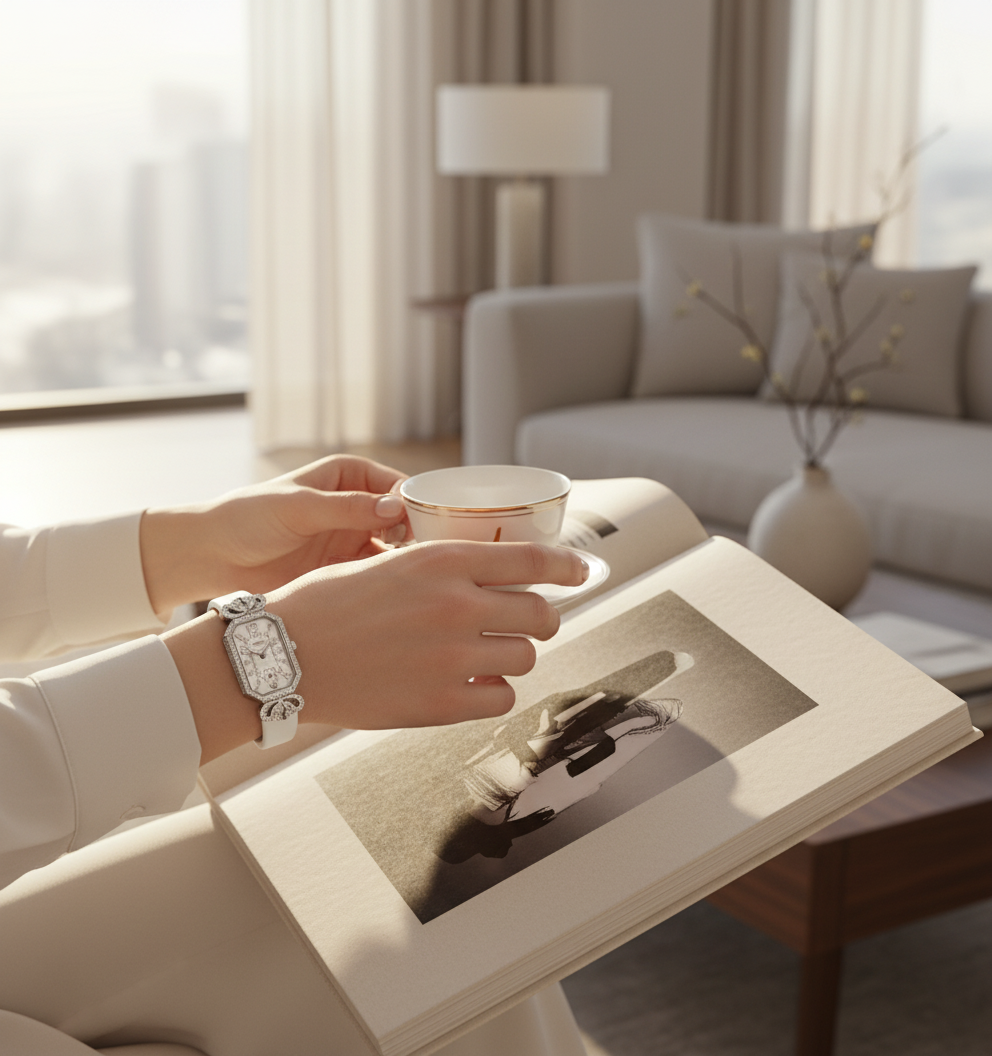Cảm giác ấy đến từ ánh kim nhẹ ôm cổ tay, từng nhịp kim trôi của cỗ máy cơ vận hành dưới lớp vàng thật. Mỗi chuyển động, mỗi tia sáng đều như thì thầm: “Thời gian có thể trôi, nhưng giá trị thật thì không bao giờ mất.”