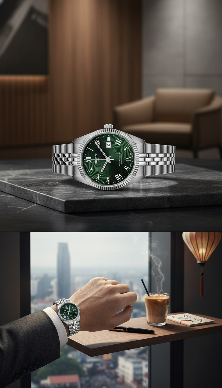 Mang hơi thở của thời đại mới, T156.408.11.093.00 thu hút ánh nhìn với mặt số xanh sang trọng, gam màu được giới sưu tầm đánh giá cao nhờ sự nam tính và chiều sâu thị giác.
