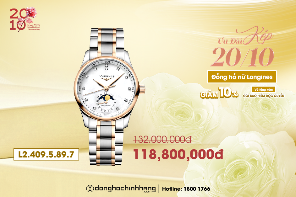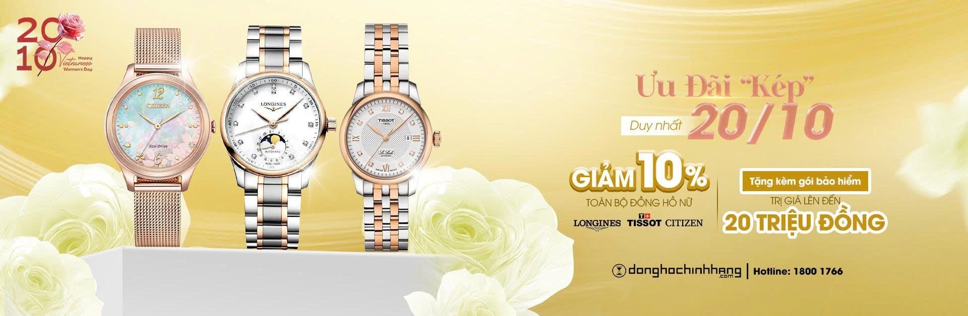 20/10 là dịp để bạn thể hiện yêu thương và sự trân trọng bằng món quà thiết thực. Một chiếc đồng hồ nữ từ Longines, Tissot hay Citizen không chỉ sang trọng mà còn gửi gắm tình cảm tinh tế, sâu sắc. Đừng bỏ lỡ ưu đãi kép duy nhất trong năm: giảm 10%, tặng gói bảo hiểm 5 năm – chỉ có tại hệ thống Donghochinhhang.com.