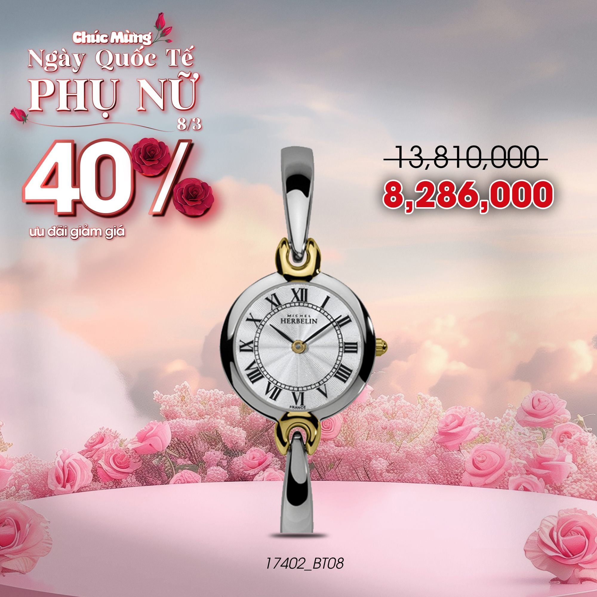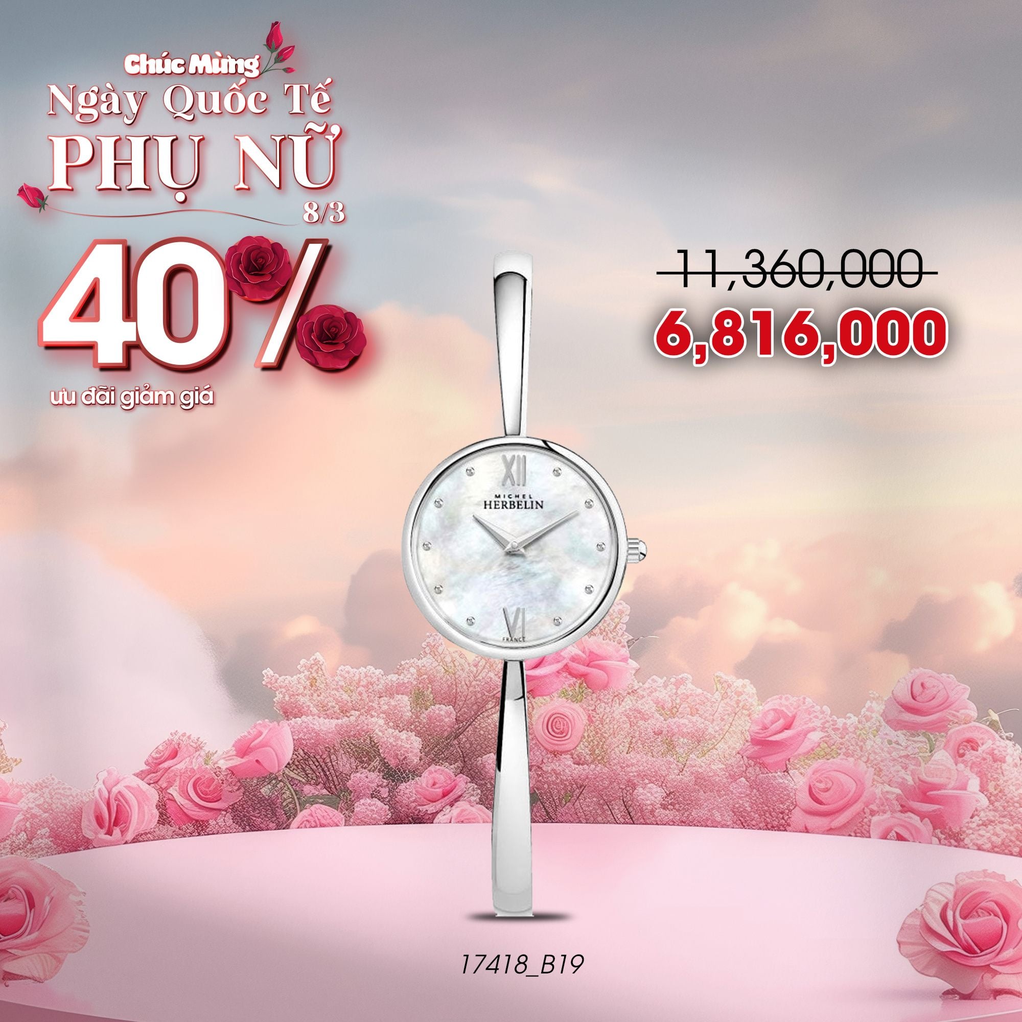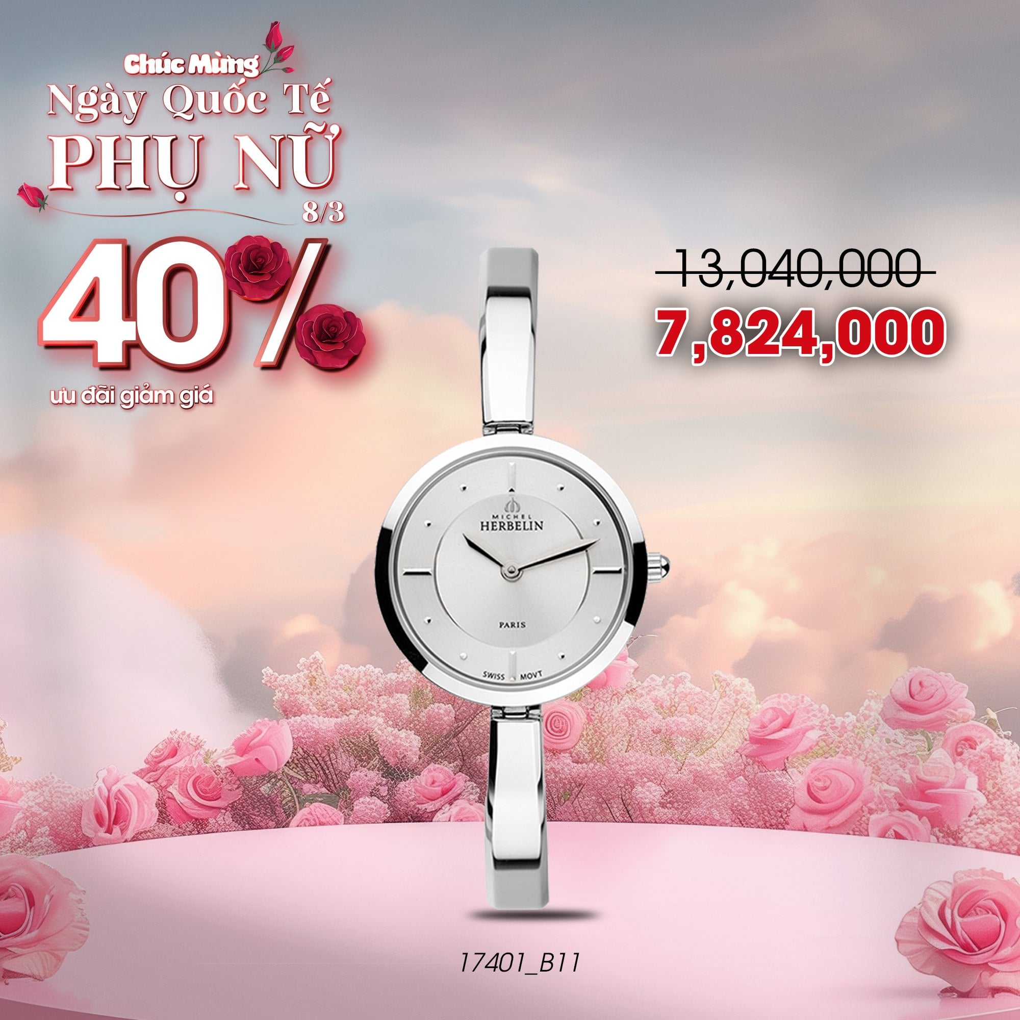8/3 là dịp để tôn vinh phái đẹp. Và thật ý nghĩa hơn khi dành tặng người phụ nữ bạn yêu thương một món quà vừa sang trọng, vừa đậm chất nữ tính như mẫu đồng hồ thời trang Michel Herbelin. Nhân dịp này, Donghochinhhang.com dành tặng bạn ưu đãi đặc biệt giảm 40% trên toàn bộ dòng sản phẩm, giúp bạn dễ dàng sở hữu một món quà hoàn hảo cho chính mình hoặc những người phụ nữ quan trọng trong cuộc đời. Đừng bỏ lỡ cơ hội này để tỏa sáng cùng Michel Herbelin! Tôn Vinh Phái Đẹp – Món Quà Ý Nghĩa Cho Ngày Quốc Tế Phụ Nữ 8/3.