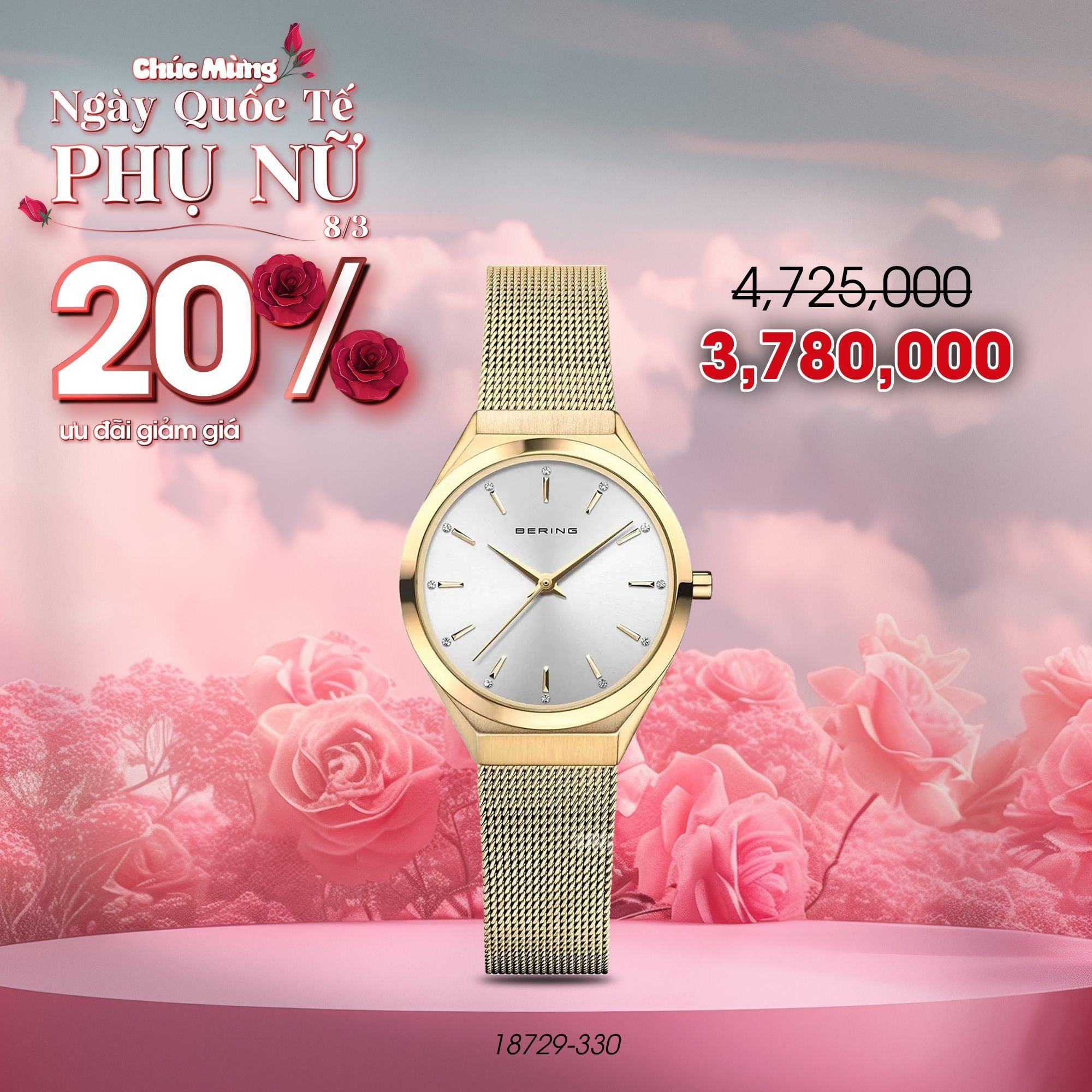 Bering Ultra Slim 18729-330 gây ấn tượng với thiết kế siêu mỏng và tối giản đặc trưng Bắc Âu. Tông vàng champagne sang trọng kết hợp dây mesh kim loại tạo cảm giác nhẹ nhàng nhưng hiện đại. Mặt số thanh thoát với cọc giờ đính đá nhỏ tạo điểm nhấn vừa đủ. Mẫu đồng hồ này phù hợp với phụ nữ yêu phong cách tinh giản nhưng vẫn muốn nổi bật.