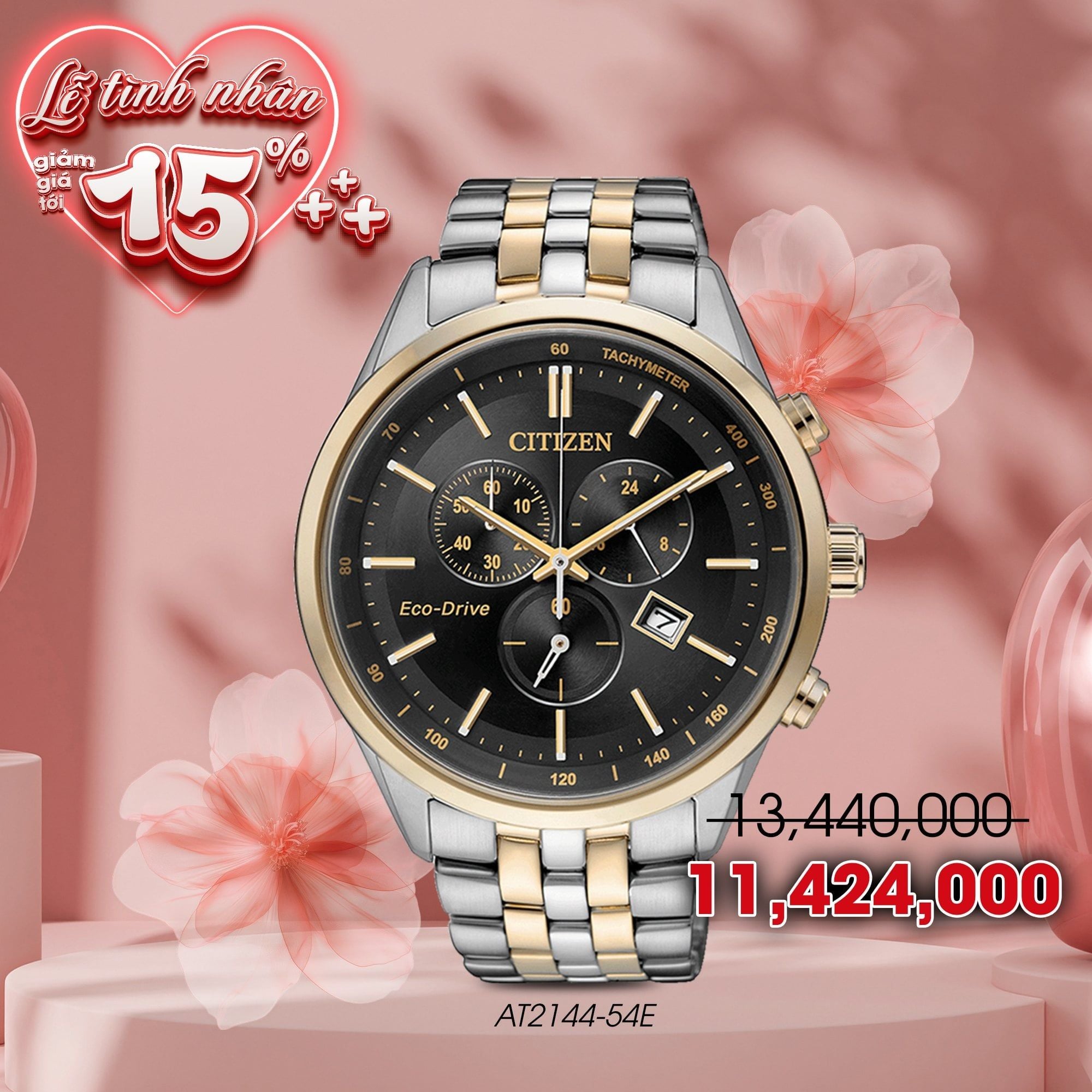 2. Citizen Eco-Drive Collection AT2144-54E lại ghi điểm nhờ công nghệ Eco-Drive sử dụng năng lượng ánh sáng. Thiết kế thể thao 6 kim bền bỉ, tiện dụng, dây thép mạ vàng vẫn giữ được nét lịch lãm, dễ đeo cùng khả năng vận hành ổn định giúp mẫu đồng hồ này trở thành lựa chọn an toàn cho Valentine, đặc biệt với những ai yêu sự tiện lợi và hiện đại.
