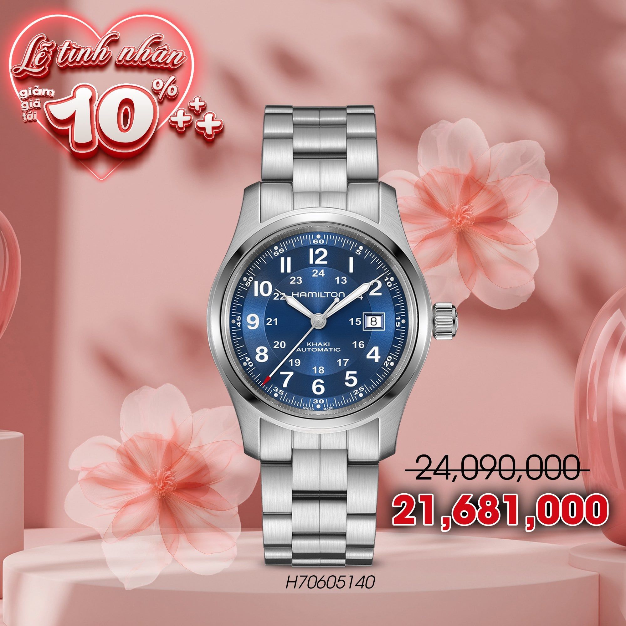 1. Hamilton Khaki Field Auto H70605140 là mẫu đồng hồ mang tinh thần mạnh mẽ, nam tính nhưng không quá phô trương. Thiết kế lấy cảm hứng từ đồng hồ quân đội Mỹ mạnh mẽ, kết hợp với bộ máy automatic bền bỉ, khiến mẫu này rất phù hợp với những chàng trai năng động và thực tế.