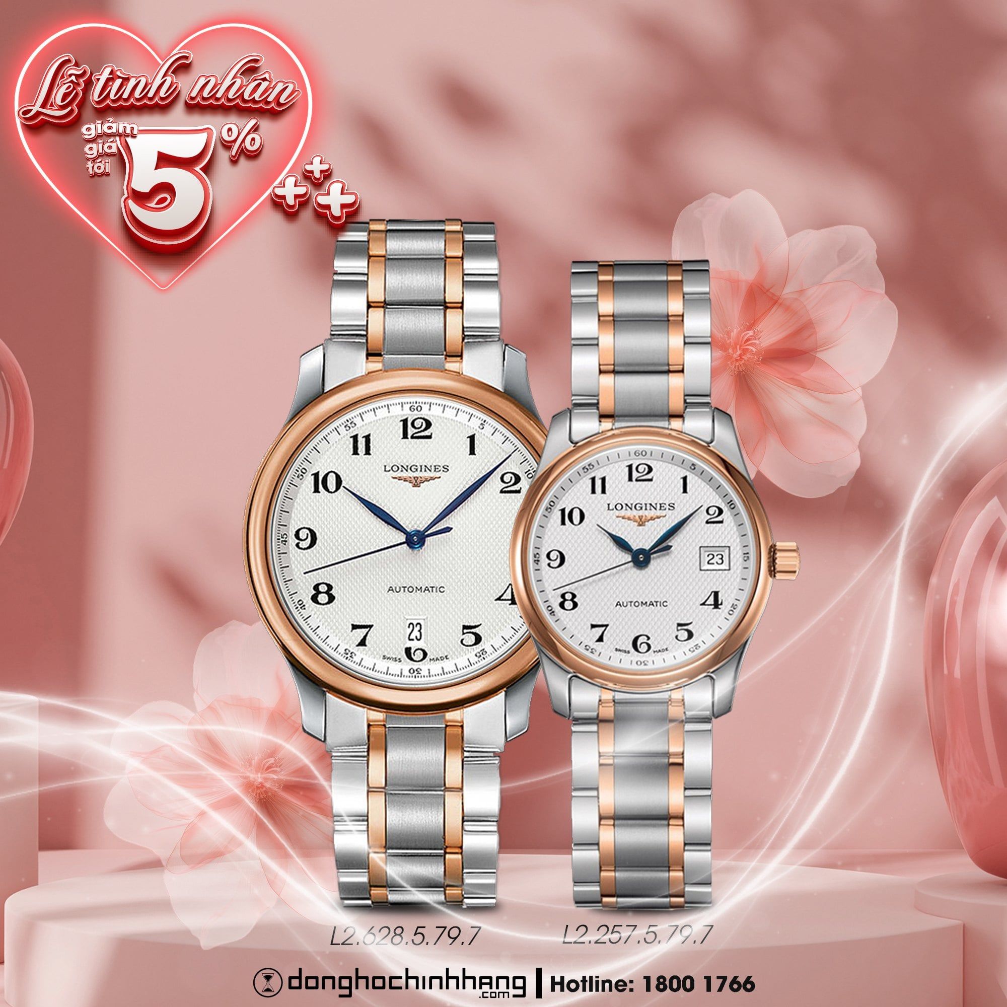 3. Ở phân khúc cao cấp hơn, Longines Master Collection L2.628.5.79.7 và L2.257.5.79.7 đại diện cho sự tinh tế và đẳng cấp. Thiết kế thép bọc vàng 18K sang trọng, kim nung xanh, chất liệu cao cấp cùng tay nghề chế tác nổi tiếng của Longines khiến cặp đồng hồ này trở thành món quà Valentine mang giá trị kỷ niệm lâu dài, không chỉ ở hiện tại mà cả trong tương lai.