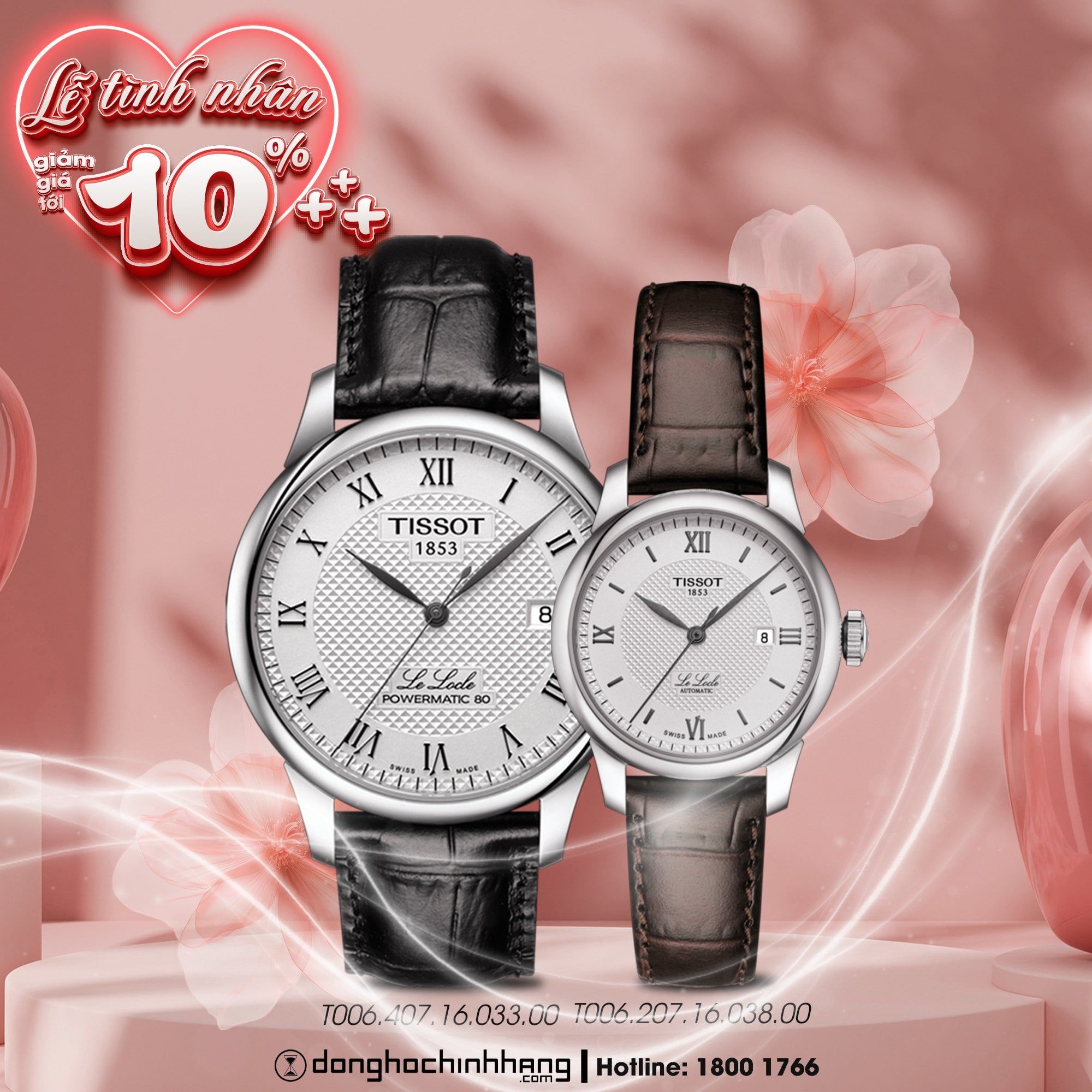 2. Tissot Le Locle T006.407.16.033.00 và T006.207.16.038.00, vẻ đẹp cổ điển Thụy Sĩ được thể hiện rõ nét qua mặt số guilloché tinh xảo, dây da ôm tay và bộ máy automatic đáng tin cậy. Dòng Le Locle thường được xem là biểu tượng của sự thanh lịch vượt thời gian, rất phù hợp để đánh dấu một mối quan hệ nghiêm túc và lâu dài.