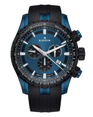 Edox đã chọn kiểu dáng thể thao cho Grand Ocean Chronograph và chọn đường kính 45 mm. Vỏ thép không gỉ của Grand Ocean có gờ với lớp phủ PVD màu đen. Có 3 bộ đếm trên mặt số: một bộ đếm giờ chronograph màu thiên thanh ở vị trí 6 giờ, một bộ đếm phút chronograph ở vị trí 9 giờ và một bộ đếm giây nhỏ ở vị trí 3 giờ. Thang đo tachymeter trên khung và cửa sổ hiển thị rõ ràng ở vị trí 4 giờ để hiển thị ngày cân bằng hoàn hảo cho bức tranh tổng thể. Grand Ocean được trang bị bộ chuyển động thạch anh luôn mang lại độ chính xác mà bạn không cần phải nhấc ngón tay.