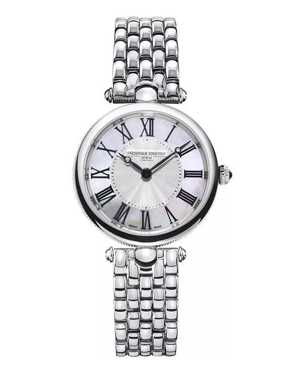Đồng hồ được trang bị bộ máy quartz FC-200, đảm bảo độ chính xác cao và dễ dàng bảo trì. Mặt số khảm trai với họa tiết guilloché, kết hợp với các chữ số La Mã và kim màu xanh lam, tạo nên điểm nhấn độc đáo. Vỏ đồng hồ bằng thép không gỉ được đánh bóng, kết hợp với dây đeo bằng thép không gỉ, mang lại vẻ đẹp thanh lịch và hiện đại. Kính sapphire chống lóa bảo vệ mặt số khỏi trầy xước và tăng độ rõ nét.