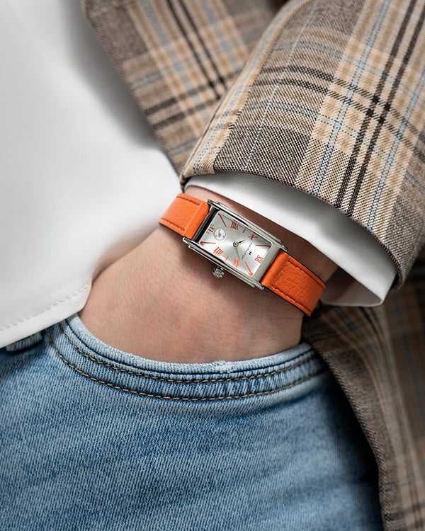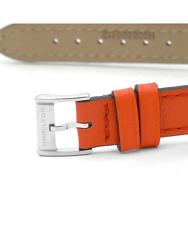 Mặt đồng hồ chi tiết được bảo vệ bằng kính khoáng . Vỏ đồng hồ được làm bằng thép không gỉ và đồng hồ bám chặt trên tay nhờ dây đeo bằng da màu cam được chế tác tinh xảo với khóa gai màu bạc.