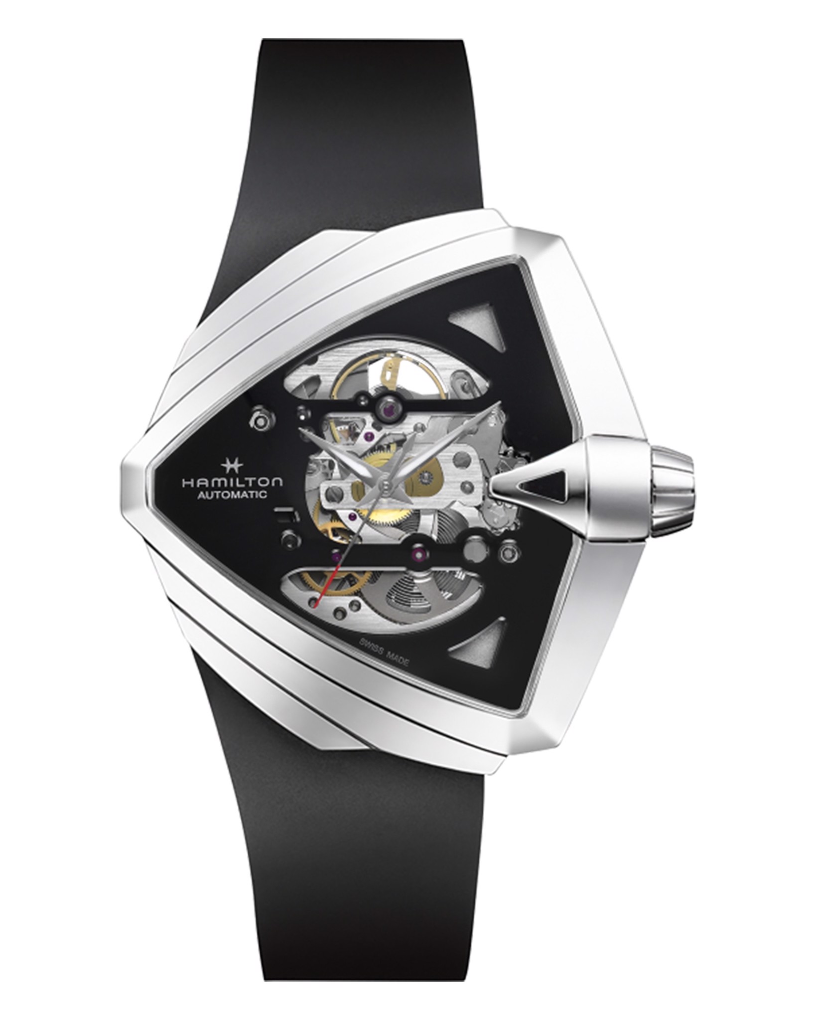 H24625330 táo bạo với VENTURA XXL SKELETON AUTO, một sự tôn vinh cực kỳ hiện đại cho quá khứ, hiện tại và tương lai của chiếc đồng hồ điện đầu tiên trên thế giới. Một sự phát triển mạnh mẽ của một chiếc đồng hồ mang tính cách mạng, mặt số có khung xương chính xác của nó có một đường ngoằn ngoèo màu đỏ nổi bật ở trung tâm của vỏ hình tam giác, được phủ PVD màu đen, bóng bẩy. Tia năng lượng này tôn vinh một biểu tượng mang tính biểu tượng của sự đổi mới và thu hút ánh nhìn vào bộ chuyển động H-10-S tự động bên dưới.