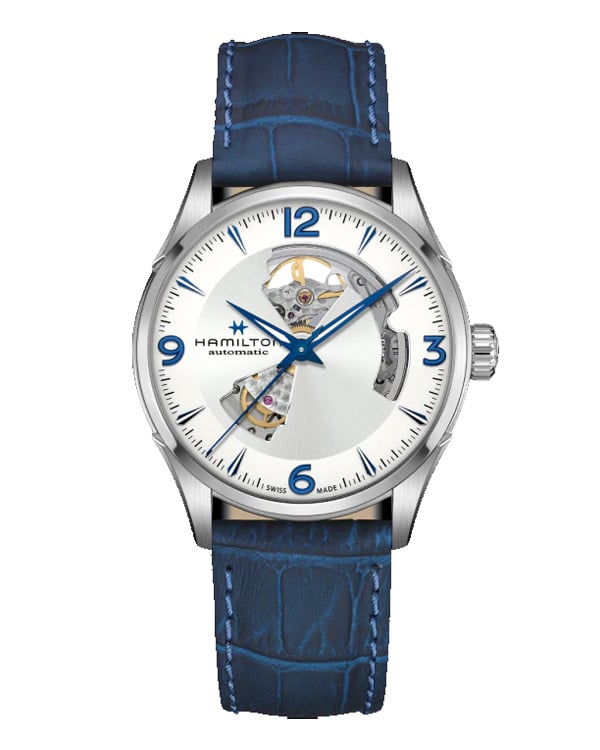 H32705651 Jazzmaster Open Heart 42mm cân bằng hoàn hảo giữa truyền thống và sự đổi mới. Thiết kế Open Heart cho thấy bộ chuyển động tự động do Thụy Sĩ sản xuất đang hoạt động bên dưới mặt số màu bạc nổi bật với kim và chỉ số màu xanh lam. Sự kết hợp giữa nền xám bạc cùng màu xanh thời thượng đã mang đến một tổng thể hài hòa nhưng vẫn nổi bật, sang trọng lịch lãm nhưng vẫn phảng phất hơi hướng của thời trang.
