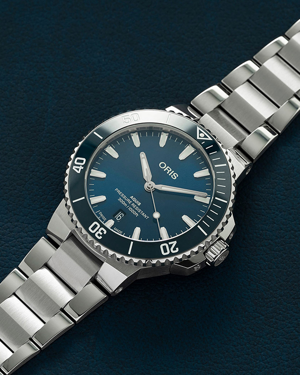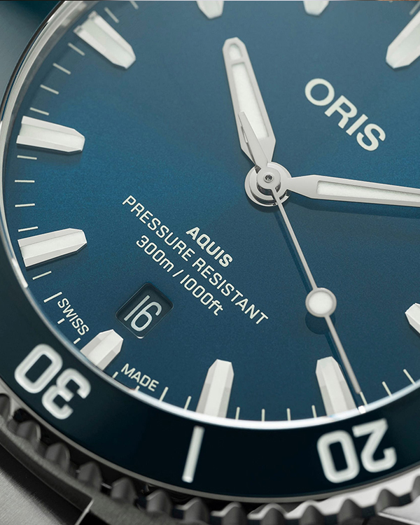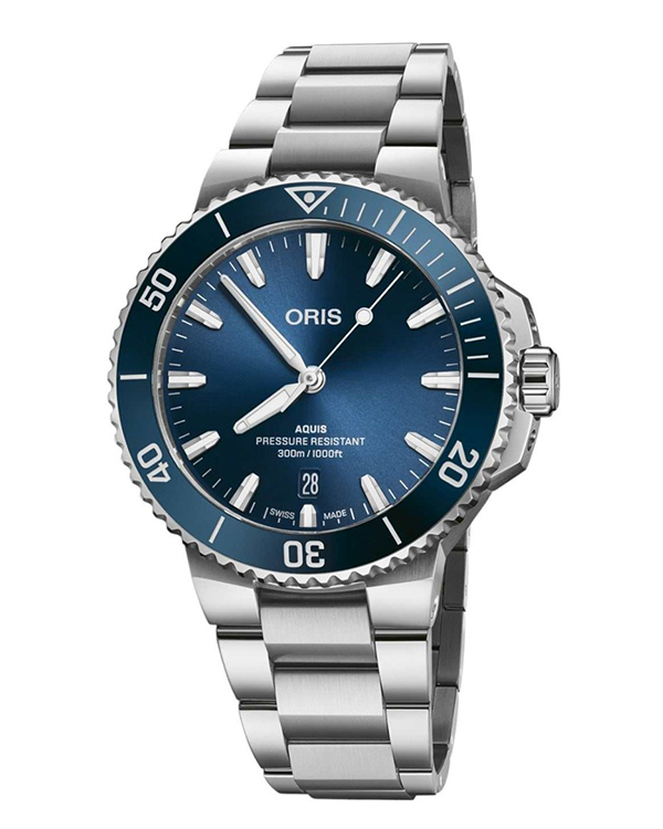Mẫu đồng hồ thuộc dòng sản phẩm Oris Aquis xuất hiện vào năm 2011 như một sự phát triển của những chiếc đồng hồ sử dụng được dưới nước của thương hiệu Oris. Chiếc đồng hồ lặn này chính là một trong những sự sáng tạo kinh điển trong nền công nghiệp sản xuất đồng hồ của thế giới. Dù là dòng đồng hồ lặn nhưng Aquis lại mang phong cách rất hiện đại và hợp thời. Aquis có sẵn với nhiều kích cỡ vỏ như 36.5mm, 41.5mm, 43,5mm. Các tính năng được chia sẻ của tất cả các mẫu Aquis Date bao gồm vỏ chống nước ở độ sâu 300m, núm vặn vặn vít, viền bezel lặn một chiều (trừ phiên bản nạm kim cương), cửa sổ lịch ngày được đặt trên mặt số ở góc 6 giờ.