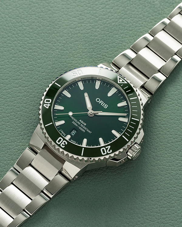 Mẫu đồng hồ thuộc dòng sản phẩm Oris Aquis xuất hiện vào năm 2011 như một sự phát triển của những chiếc đồng hồ sử dụng được dưới nước của thương hiệu Oris. Chiếc đồng hồ lặn này chính là một trong những sự sáng tạo kinh điển trong nền công nghiệp sản xuất đồng hồ của thế giới. Dù là dòng đồng hồ lặn nhưng Aquis lại mang phong cách rất hiện đại và hợp thời. Aquis có sẵn với nhiều kích cỡ vỏ như 36.5mm, 41.5mm, 43,5mm. Các tính năng được chia sẻ của tất cả các mẫu Aquis Date bao gồm vỏ chống nước ở độ sâu 300m, núm vặn vặn vít, viền bezel lặn một chiều (trừ phiên bản nạm kim cương), cửa sổ lịch ngày được đặt trên mặt số ở góc 6 giờ.