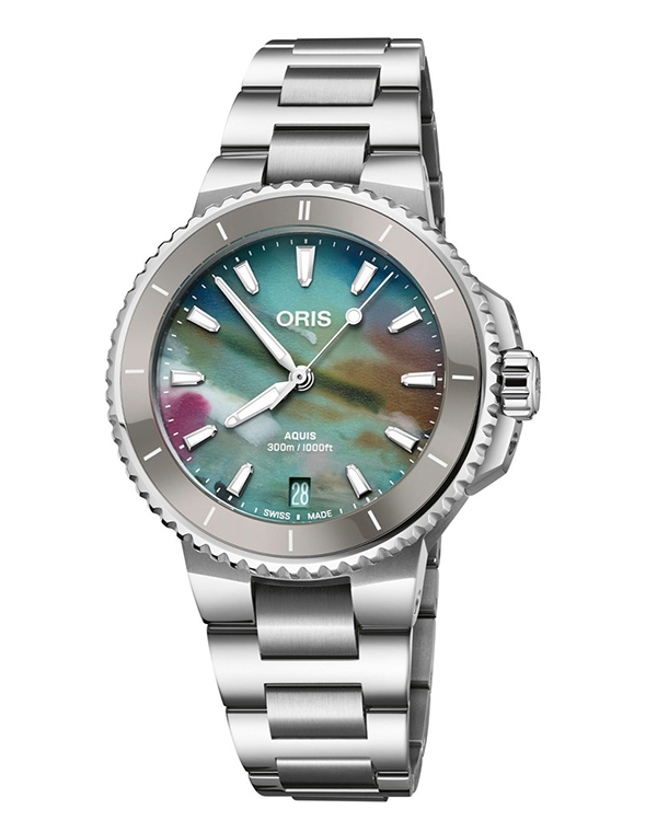 Mẫu đồng hồ thuộc dòng sản phẩm Oris Aquis xuất hiện vào năm 2011 như một sự phát triển của những chiếc đồng hồ sử dụng được dưới nước của thương hiệu Oris. Chiếc đồng hồ lặn này chính là một trong những sự sáng tạo kinh điển trong nền công nghiệp sản xuất đồng hồ của thế giới. Dù là dòng đồng hồ lặn nhưng Aquis lại mang phong cách rất hiện đại và hợp thời. Aquis có sẵn với nhiều kích cỡ vỏ như 36.5mm, 41.5mm, 43,5mm. Các tính năng được chia sẻ của tất cả các mẫu Aquis Date bao gồm vỏ chống nước ở độ sâu 300m, núm vặn vặn vít, viền bezel lặn một chiều (trừ phiên bản nạm kim cương), cửa sổ lịch ngày được đặt trên mặt số ở góc 6 giờ.