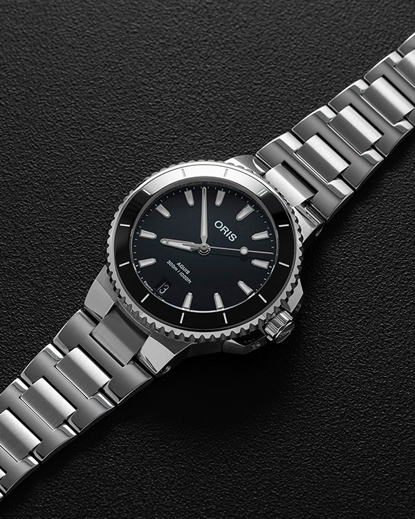 Mẫu đồng hồ thuộc dòng sản phẩm Oris Aquis xuất hiện vào năm 2011 như một sự phát triển của những chiếc đồng hồ sử dụng được dưới nước của thương hiệu Oris. Chiếc đồng hồ lặn này chính là một trong những sự sáng tạo kinh điển trong nền công nghiệp sản xuất đồng hồ của thế giới. Dù là dòng đồng hồ lặn nhưng Aquis lại mang phong cách rất hiện đại và hợp thời. Aquis có sẵn với nhiều kích cỡ vỏ như 36.5mm, 41.5mm, 43,5mm. Các tính năng được chia sẻ của tất cả các mẫu Aquis Date bao gồm vỏ chống nước ở độ sâu 300m, núm vặn vặn vít, viền bezel lặn một chiều (trừ phiên bản nạm kim cương), cửa sổ lịch ngày được đặt trên mặt số ở góc 6 giờ.