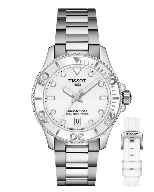 T120.210.11.011.00 Tissot Seastar 1000 Quartz là sự lựa chọn cho những thợ lặn thực sự. Với khả năng chống nước cao lên đến áp suất 30 bar (300 m / 1000 ft), núm vặn, mặt sau và gờ bằng gốm đơn hướng, máy quartz chính xác cao, các mẫu đồng hồ Tissot Seastar 1000 Quartz là lựa chọn hoàn hảo cho những cô nàng cá tính, đam mê các hoạt động thể thao dưới nước.