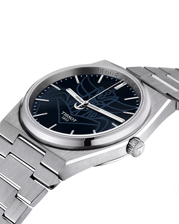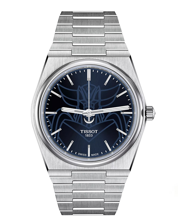 Vỏ và dây đồng hồ làm từ thép không gỉ, với thiết kế tích hợp dây liền vỏ, mang lại sự liền mạch và hoàn thiện cao cấp. Mặt số xanh lam với họa tiết vân nổi giúp tạo điểm nhấn đặc biệt cho cổ tay.